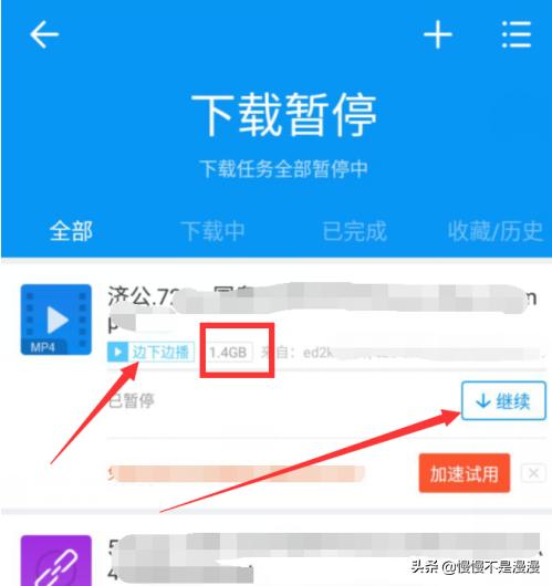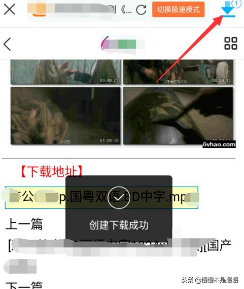 5、此时如下图1,界面中间弹出创建任务成功提示。这时点击右上角下载图标,即可进入进度页,如下图2,可看到文件大小,及预计时间,等其完成即可。